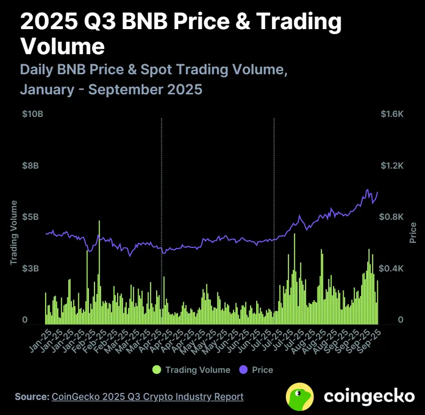 BNB 在 2025 Q3 收于 $1,030(+57.3%) ,并在进入 Q4 后继续攀升至 $1,369 的新高。