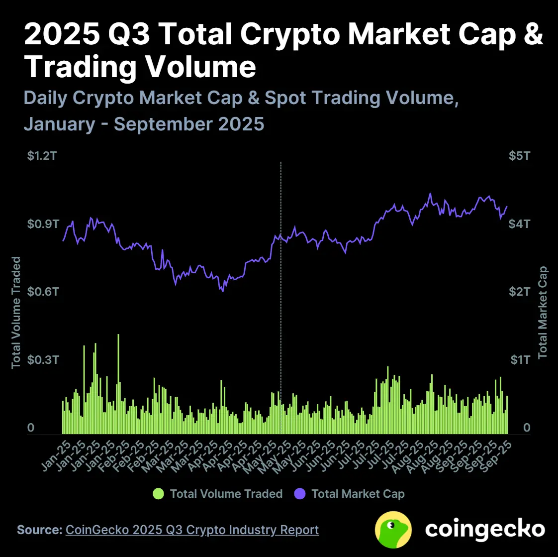 2025 年第三季度,加密货币总市值增加 5,636 亿美元(+16.4%) ,季度末达到 4.0 万亿美元 ,实现连续第二个季度的显著资本增长。