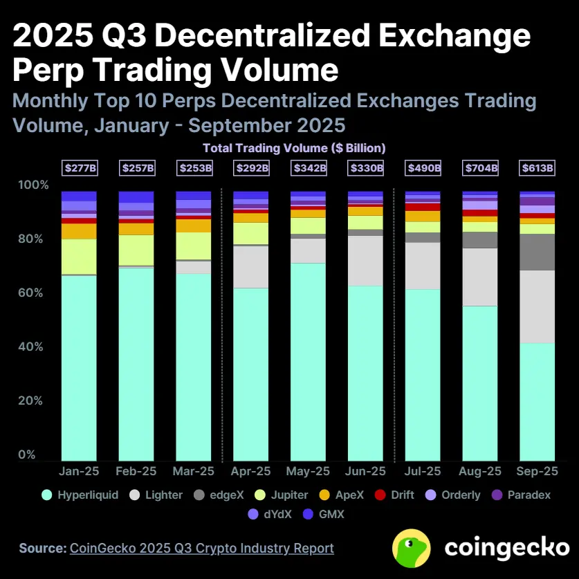 2025 Q3,前十大去中心化永续合约交易所(Perp DEX,不含 Aster)总交易量增长 +87.0% ,从 9,645 亿美元 升至 1.81 万亿美元 。