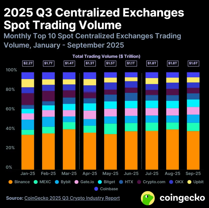 中心化交易所(CEX)现货交易量环比增长 +31.6% ,达 5.1 万亿美元 ,其中 Binance 与 Bybit 领跑市场。