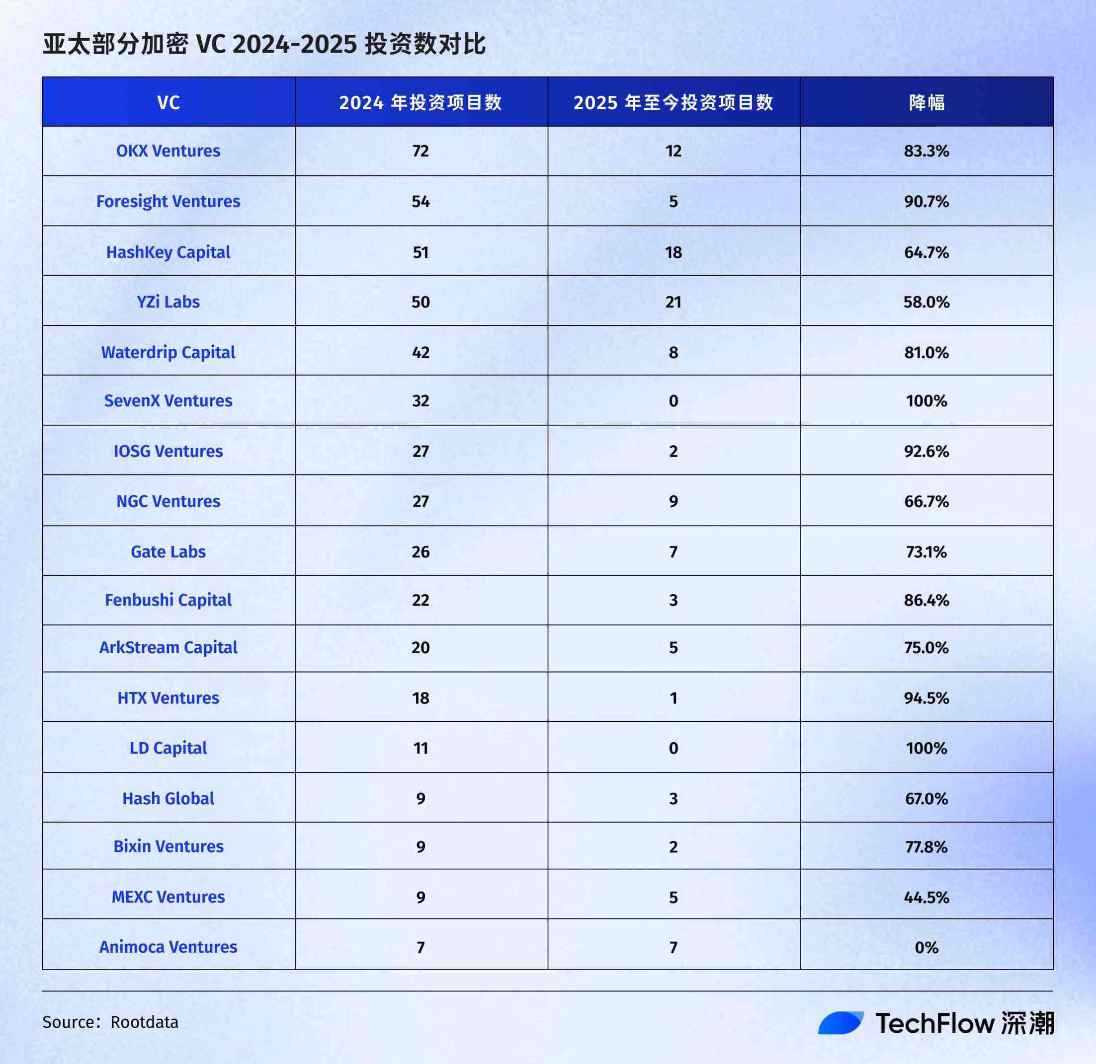 RootData 的数据显示,相较于 2024 年,2025 年至今亚洲加密 VC 在一级市场出手次数呈现断崖式下跌。