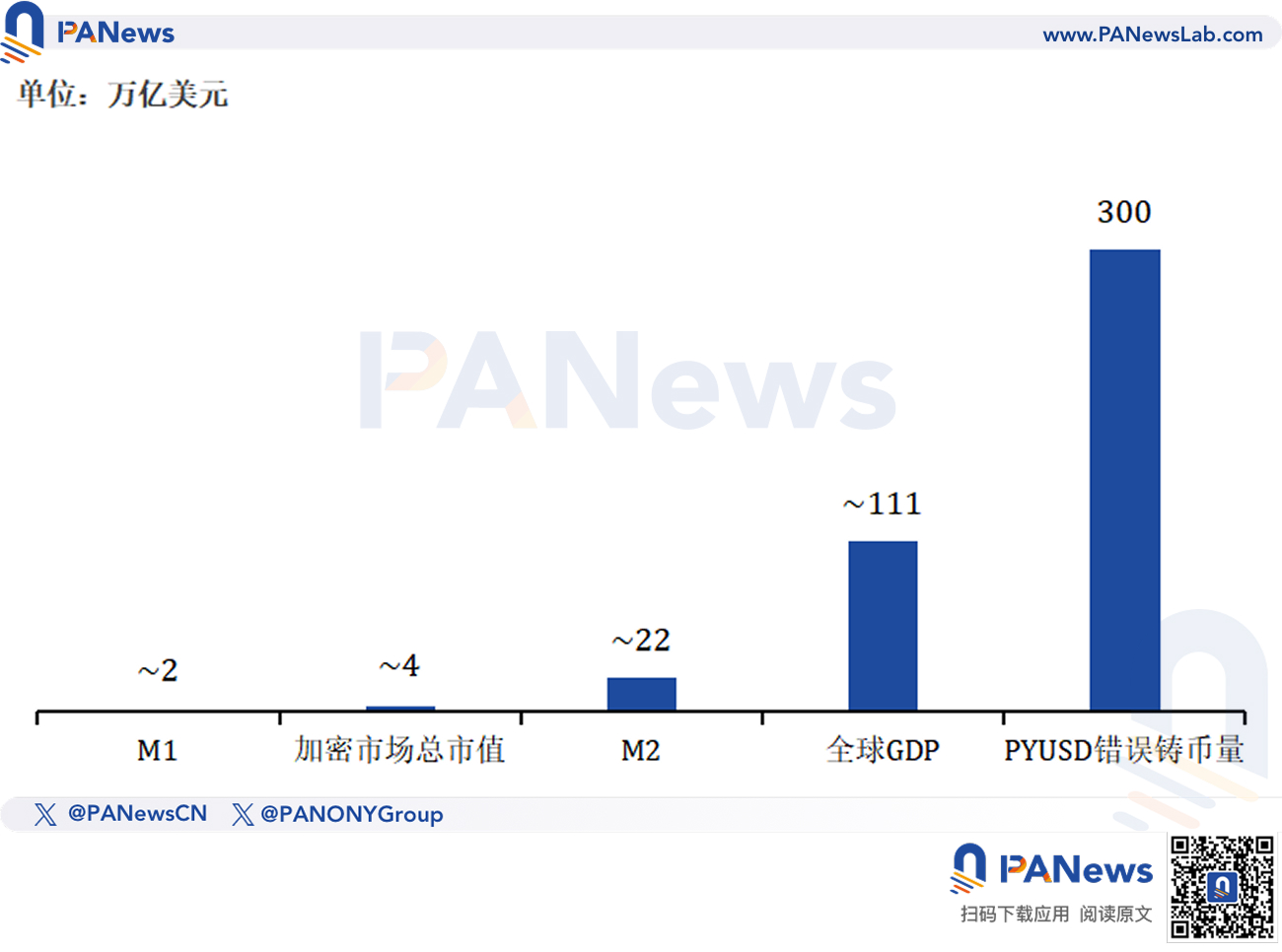 Paxos在尝试纠正其失误时,“胖手指”突发(一种参数输入错误,典型症状就是多输入了几个零),意外铸造了300万亿PYUSD的供应。CoinMarketCap数据显示,PYUSD目前市值仅约26亿美元,其错误铸币量相当于流通供应量的113,250倍,两者形成了强烈的对比。如果按1美元计价,PYUSD的错误铸币总额相当于全球 GDP两倍多,远超美国M1/M2与整个加密市场市值。这意味着,即便Paxos拥有足额储备,但面对300万亿的供应,其资产抵押率也将瞬间归零,用户持有的PYUSD亦将分币不值,导致市场信心崩溃并引发连锁反应。