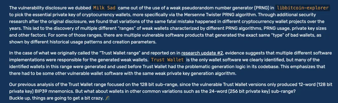 然而,拿到链上地址并不等于掌控资产,更加关键的是私钥的掌控权。目前关于美国政府具体如何获得这些私钥的过程尚无准确消息,据 Arkham 调查,Lubian 矿池在运营中没有为钱包私钥生成使用足够安全的随机算法,其密钥生成算法存在可以被暴力破解的弱点,但是 Cobo 联合创始人神鱼表示,执法机构并非通过暴力破解或入侵方式获得私钥,而是因发现这些私钥在生成时存在随机性缺陷。据不完全统计显示,受该漏洞影响的地址超过 22 万个,完整列表已公开。