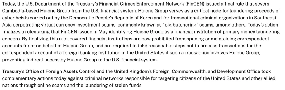 因此 OFAC 为了打击整个利益链条,对 包括太子集团跨国犯罪组织在内的 146 个目标实施了全面制裁。其中处于陈志等犯罪团伙控制之下的 汇旺集团(Huione Group) 作为是柬埔寨本地的金融与电商生态,包含 HuionePay、Telegram 中介类市场等,直接被美国金融犯罪执法网络局(FinCEN)认定为太子集团主要洗钱活动的核心链条之一。