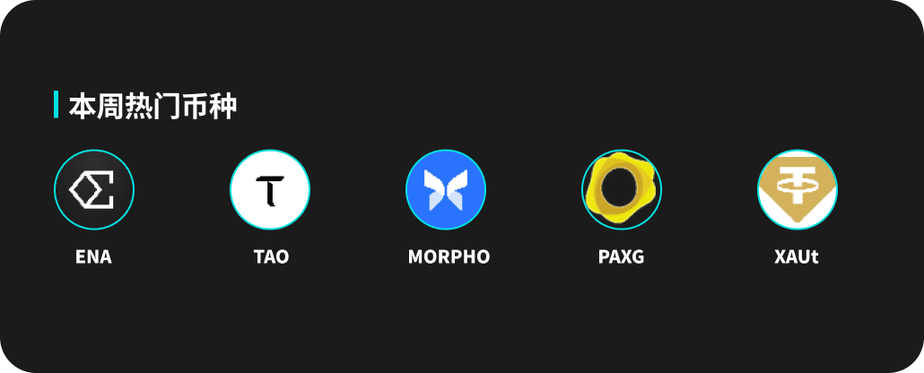 热门币种方面,ENA、TAO、MORPHO、PAXG 和 XAUt 都有着不俗的表现。ENA本周价格上涨13.29%,24小时交易量1.3B。TAO价格上涨8.3%。XAUt和PAXG本周分别上涨4.11%和4.26%。