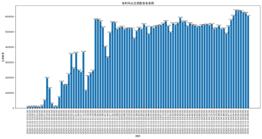 以下是10月11日00:17-05:08各Batch提交时间点处理交易数的统计图: