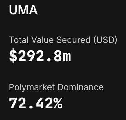 理解目前 UMA 的垄断地位,可以通过预测市场中的 TVS 来衡量。TVS(total value secured)衡量预言机保障的价值总量,目前主要是 Polymarket 的 80% 的市场份额,Chainlink 用于剩下的 20% 价格市场。