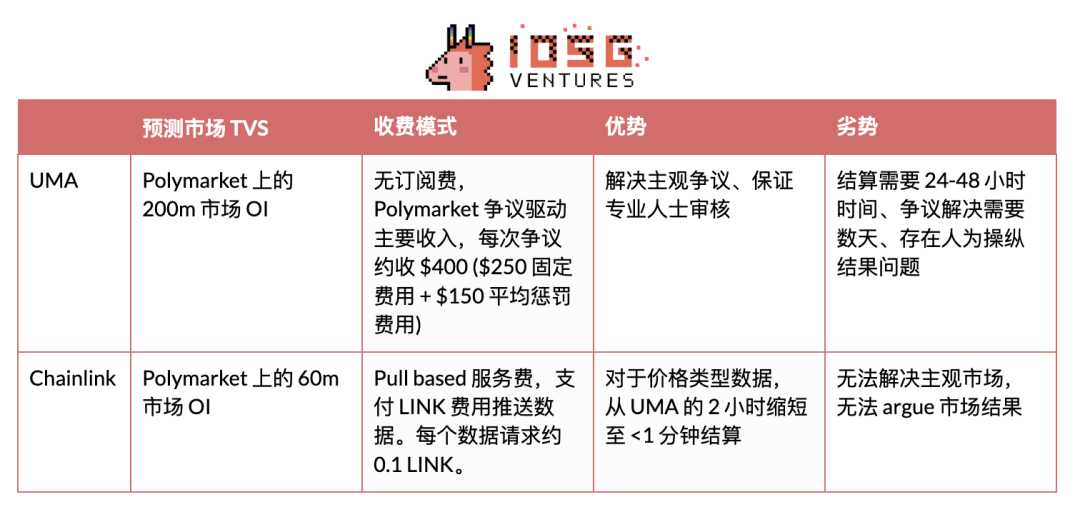 结构化数据预言机服务,以价格数据市场为首。这些市场如“BTC 的价格在某一时刻达到 $XXX”则可以较好的通过价格预言机如 Chainlink 直接解决。事实上在 UMA 此前的解决争议的 escalation manager 中就已经存在 chainlink 对于价格争议的解决路由。Polymarket 与 chainlink 的直接合作让这一点更快速解决。