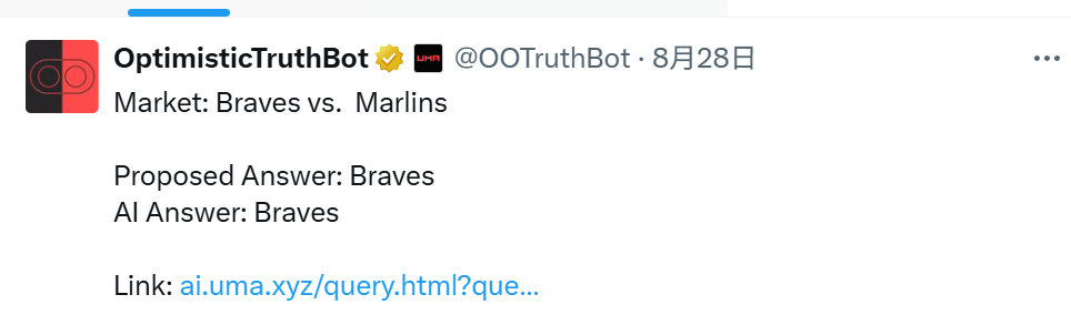 UMA目前也在探索新的颠覆式架构,其正在与 EigenLayer 合作,研究并有探索利用 Eigenlayer 的质押系统开发下一代预言机,同时其也在 AI 方面做一些新的尝试,Optimistic Truth Bot 是一个预测市场中的提案者代理。它监听 Polymarket 的问题,7/24 地第一时间提出问题的最有可能的答案并等待挑战,大幅减少结算时间。可以通过 @OOTruthBot 推特帐号找到看到具体市场。