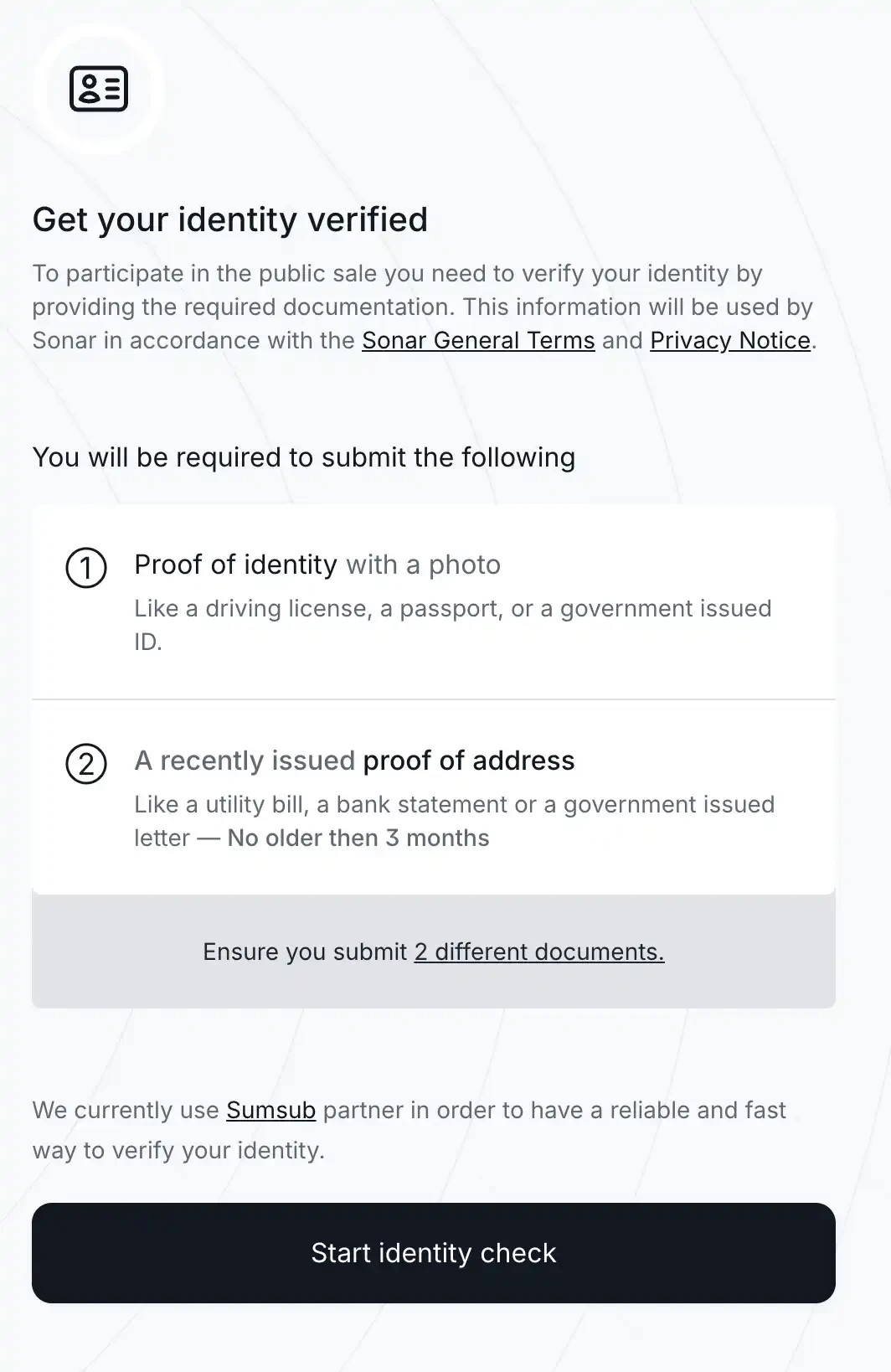Sonar 上目前最火的 ICO 是 MegaETH,10 月 15 日至 10 月 27 日期间处于注册时间,注册截止时间还有 6 天。完成 KYC 身份验证步骤比较多,但在资料完善且顺利的情况下几乎是秒通过的,如果需要等待的话则是在进行人工审核,需要等待至少 1-3 天,因此尽早完成 KYC。