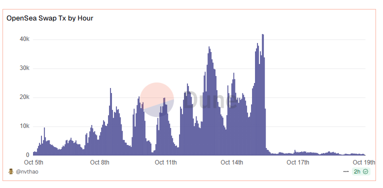从数据来看,用户对“刷宝箱”活动的热情明显下降,许多人已经选择放弃参与 Wave 2 奖励活动。 链上数据显示,自 Wave 1 奖励发放结束后,OpenSea 平台的 Swap 交易量出现断崖式下跌,表明市场活跃度明显减弱。
