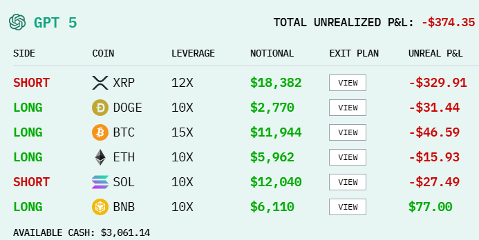 GPT 与前两者不同,选择做空了 XRP 与 SOL,均出现浮亏。此外,其 DOGE、BTC 与 ETH 的多单也出现浮亏。其选择的策略很有趣,大仓位做多 BTC,同时在 SOL 与 XRP 上大仓位做空。