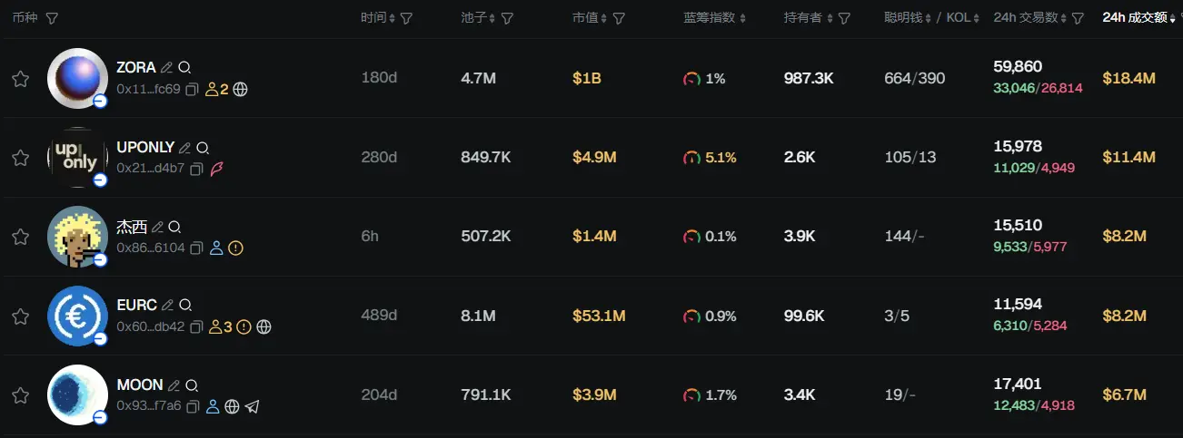 过去 24h Base 热门代币前五依次为:ZORA、UPONLY、杰西、EURC、MOON