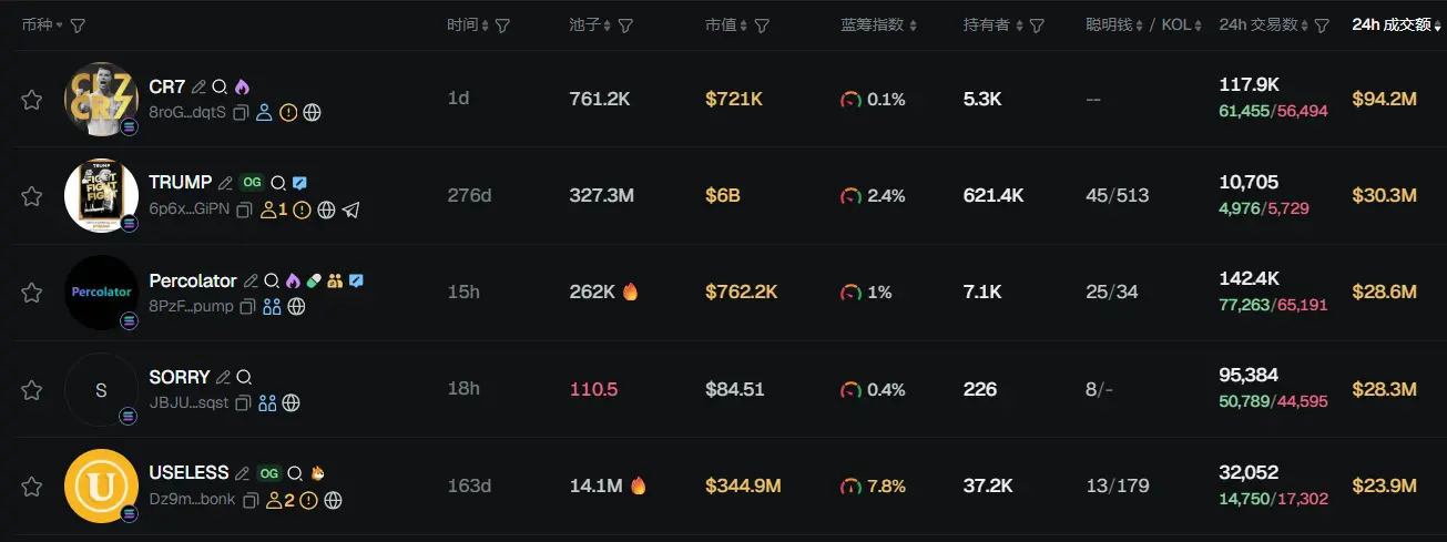 过去 24h Solana 热门代币前五依次为:CR7、TRUMP、Percolator、SORRY、USELESS