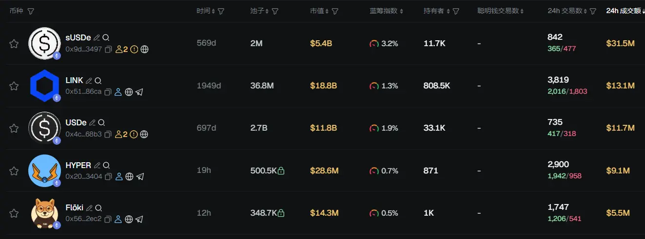 过去 24h ETH 热门代币前五依次为:sUSDe、LINK、USDe、HYPER、 Flōki