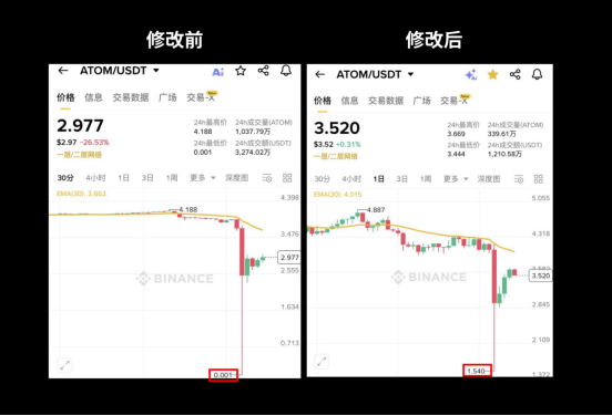 针对ATOM、IOTX等插针归零的代币,币安竟然对其历史K线进行了修改,将其最低的归零价格重新调整。此举再度引发舆论漩涡,不少用户公开表示明目张胆修改K线是交易所极度操控的行为,不应得到支持,否则交易所数据的准确性难以保障。随着用户不满的增加,币安随后再度将K线还原,同时对归零问题也给出了报告,表示归零原因是平台上存在多年的历史限价单,系统会自动进行撮合,暴跌后成为了底部支撑价,形成插针原因,同时存在部分交易对暴跌后价格数量级太小,因此前端系统直接显示为零。
