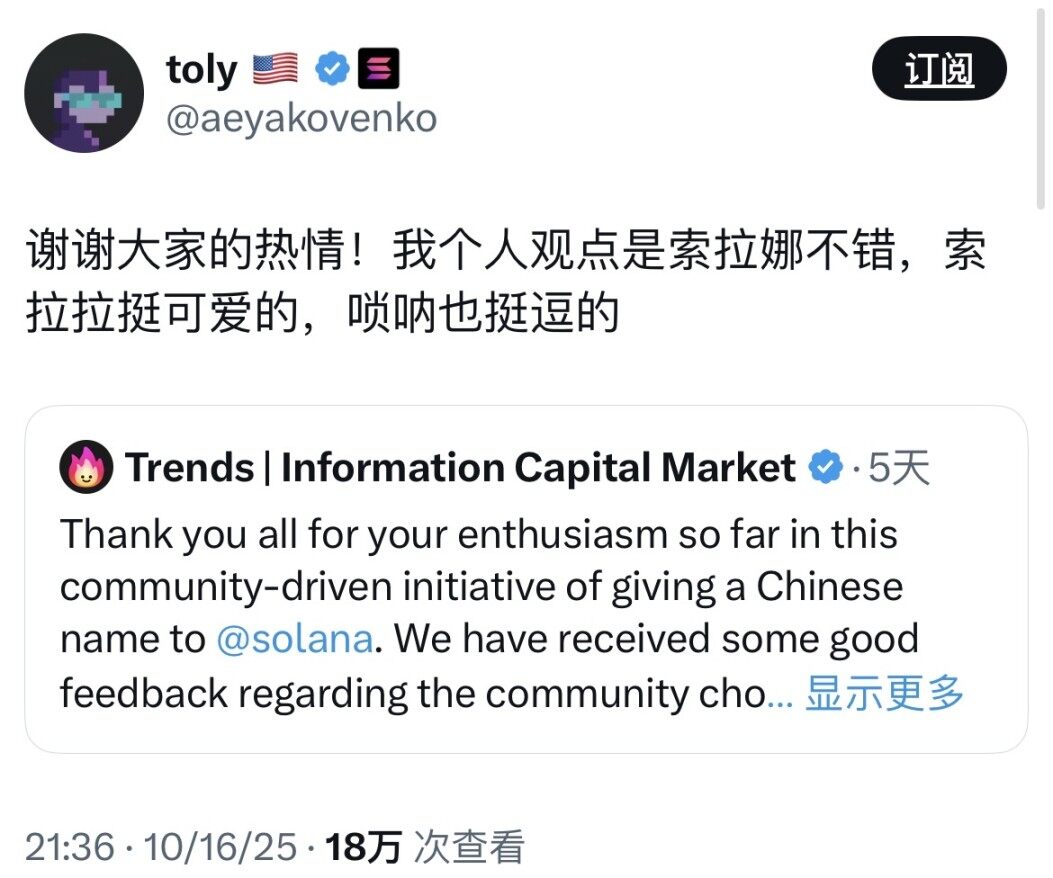 这一命名过程始于 10 月 14 日,内容代币化平台 Trends.fun 发起了「为 Solana 征集中文名」活动,设置了 100 SOL 的奖池。活动规则要求参与者引用转发官方推文并提交提议的中文名,最佳提案将获得 66 SOL 奖励。