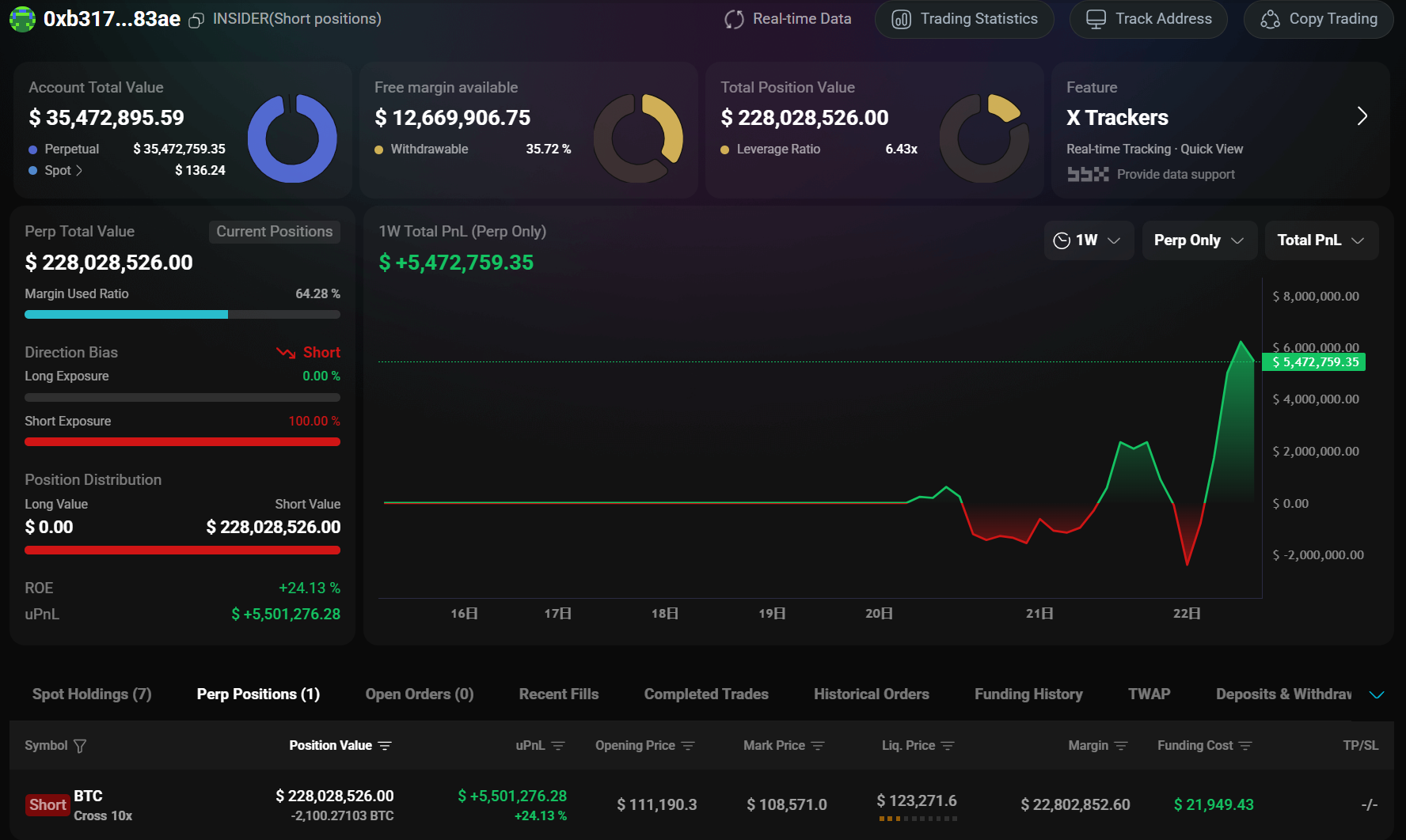 现在加密市场的唯一真正交易明星就是“10.11 内幕巨鲸 ”,其当前已再度出手 10 倍做空 BTC 。当前空单仓位价值 2.27 亿美元,现已 浮盈超 500 万美元 ,清算 123,271 美元。
