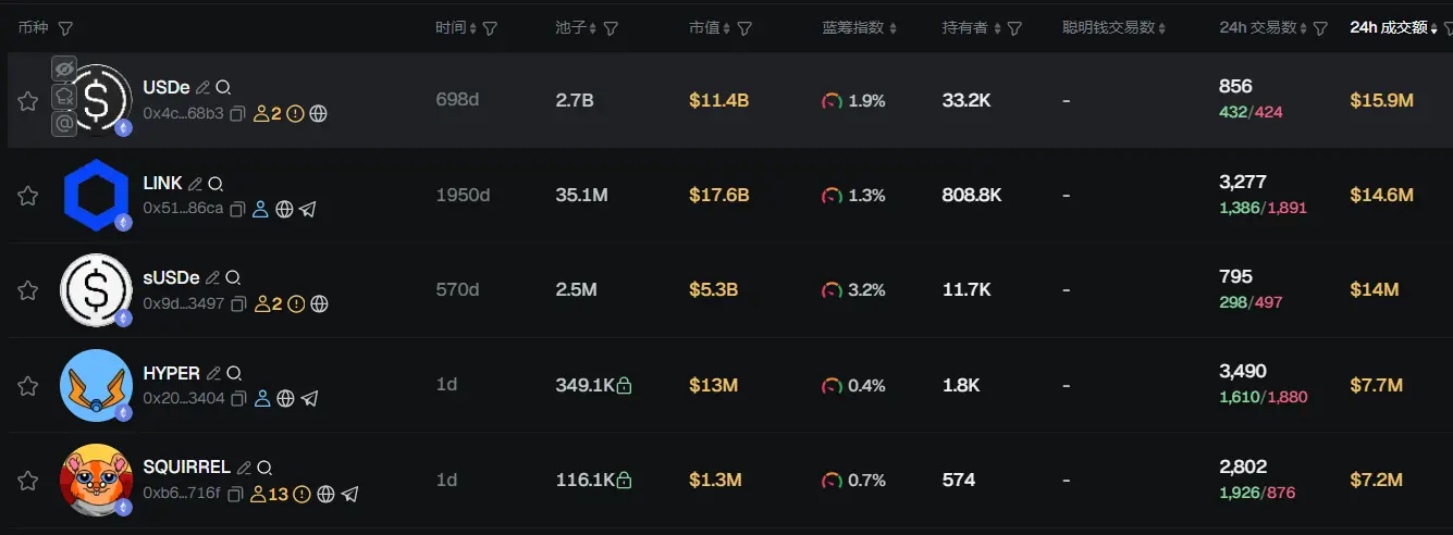 过去 24h ETH 热门代币前五依次为:USDe、LINK、sUSDe、HYPER、SQUIRREL