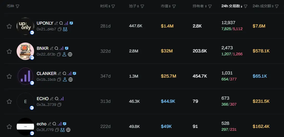 过去 24h Base 热门代币前五依次为:UPONLY、BNKR、CLANKER、ECHO、echo