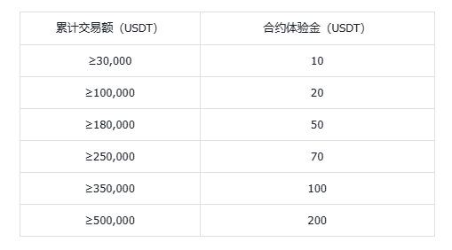 活动期间内,累计有效合约交易额达到不同档次,即可领取对应的合约体验金!