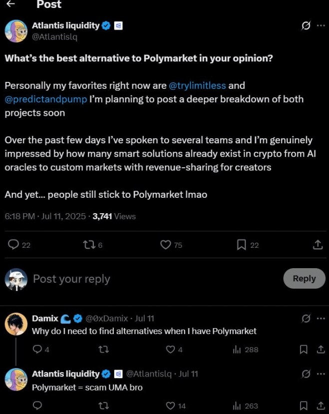 更糟糕的是,这个所谓的“值得信赖的 DAO”从一开始就对 Polymarket 不忠诚。就在几个月前,该团体的领导人 Atlantis Liquidity 在 X 平台上公开称 Polymarket 是“骗局”,并推广其他竞争平台如 Limitless 和 PNP Exchange,甚至嘲笑使用 Polymarket 的用户。