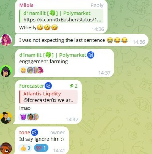 泄露的 Telegram 消息显示,这个团体成员还嘲笑那些失去 Polymarket 社区徽章的用户,并开玩笑说要向团队举报。