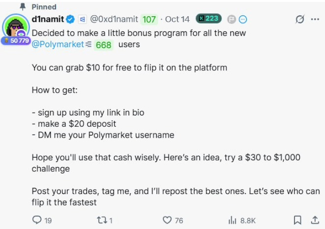 “黑手党”成员之一 d1namit 发布了一条帖子进行了一项推广活动,承诺通过他的 Polymarket 链接注册的用户将获得 10 美元的奖励,但这实际上是一个拉新陷阱,滥用了 Polymarket 推荐系统和统计数据。