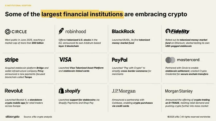 机构采用迅速增加。传统机构 —— 包括花旗集团、富达、摩根大通、万事达卡、摩根士丹利和 Visa—— 现在正在 ( 或计划 ) 直接向消费者提供加密货币产品 , 允许他们购买、出售和持有数字资产 , 以及股票、交易所交易产品和其他传统工具。与此同时 ,PayPal 和 Shopify 等平台正在加倍投入支付领域 , 并为商家和客户之间的日常交易构建基础设施。