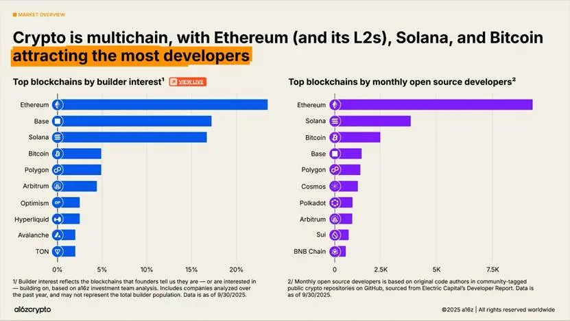 在 builder 方面 , 加密货币仍然是多链的 , 比特币、以太坊 ( 及其 Layer 2) 和 Solana 吸引了最多的开发者。以太坊及其 Layer 2 是 2025 年新开发者的首选目的地。同时 ,Solana 是增长最快的生态系统之一 , 过去两年 builder 兴趣增长了 78% 。下图反映了创始人告诉我们的他们正在构建或感兴趣构建的生态系统数量 —— 基于 a16z 加密投资团队分析。(您可以在我们的加密货币现状仪表盘中更仔细查看这些和其他趋势。)