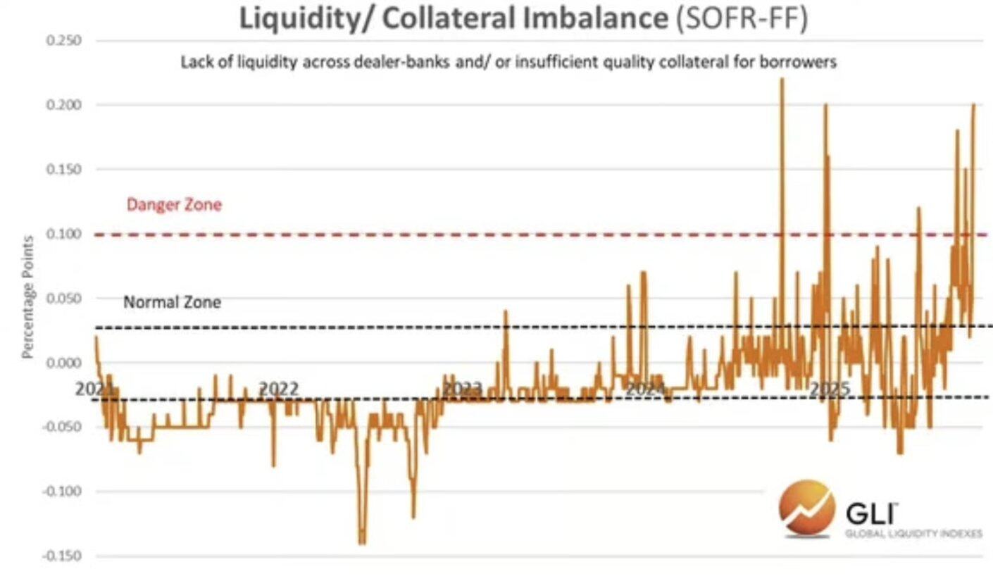 下图显示,们可以看到隔夜融资时段内做市商银行之间流动性与可用抵押品之间的失衡日益加剧。这表明货币市场正面临流动性短缺,做市商要么缺乏现金,要么缺乏抵押品。