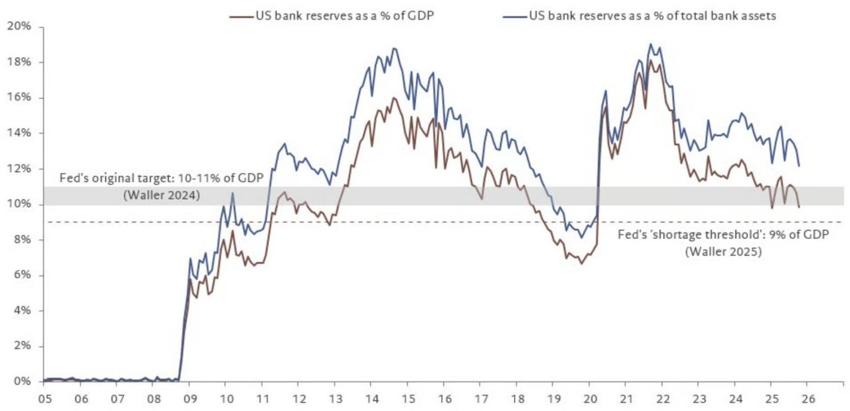 随着这些因素发酵, 银行准备金正接近美联储设定的短缺水平 。