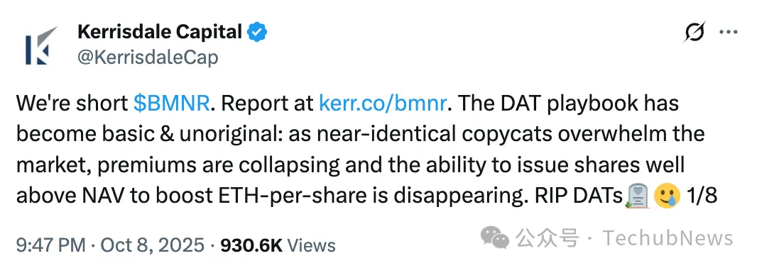 知名做空机构 Kerrisdale Capital 曾公开表示,将做空 BitMine。其认为,目前 DAT 模式已逐渐走向平庸,市场竞争加剧导致溢价迅速下滑,发行方难以再通过高于净值(NAV)增发股份来提升每股 ETH 持有量。曾经追逐「加密资产国库策略」的公司原计划筹集超 1000 亿美元资金,却因此打破了支撑高溢价的稀缺性。如今,许多此类公司股票交易价已接近或低于净值,自我循环机制陷入停滞,溢价交易逻辑也不再成立,整个模型开始崩塌。