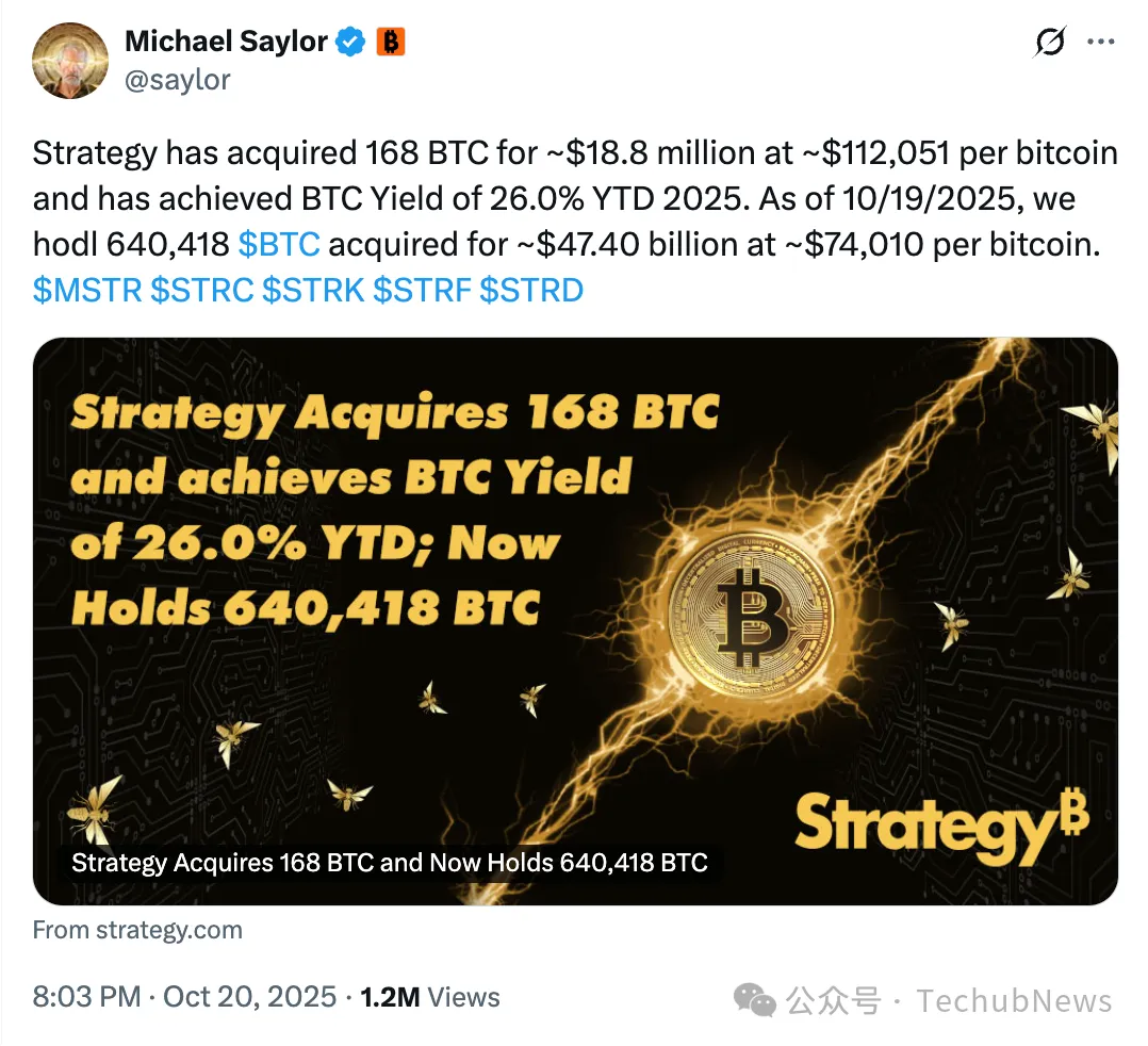这种循环也创造了一种结构性优势,并且会随着时间的推移而不断累积。这也可以从股票表现中看出,以 MSTR 为例,尽管其近期股价不断下跌,但整体依旧远远高于其投资比特币前的股价水平。从浮盈角度来看,截至 10 月 19 日,Strategy 已实现 2025 年迄今 26.0% 的 BTC 收益率,呈现出稳定增长的趋势。按照比特币当前价格计算,Strategy 迄今为止的浮盈依旧高达约 220 亿美元。