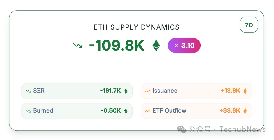 StrategicETHReserve.xyz 数据显示,截至撰稿时,上市公司持有的以太坊总持仓量为 574 万枚,在过去 7 日内,这一数字已减少了约 16.17 万枚。即便在以太坊财库公司 BitMine、SharpLink 持续发力增持的情况下,持仓量依然出现了下滑。链上监测数据显示,自「10.11」市场崩盘以来,BitMine 至少已增持近 38 万枚以太坊,SharpLink 同样于 10 月 19 日以 3892 美元的平均价格购入 19271 枚以太坊。在此基础上,以太坊持仓量的减少,表明更多中小型企业正在选择卖出以太坊。