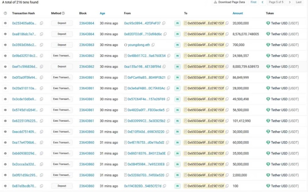 预存款活动前,10 个资金来源相同的巨鲸地址合计存入 6 亿枚 USDT