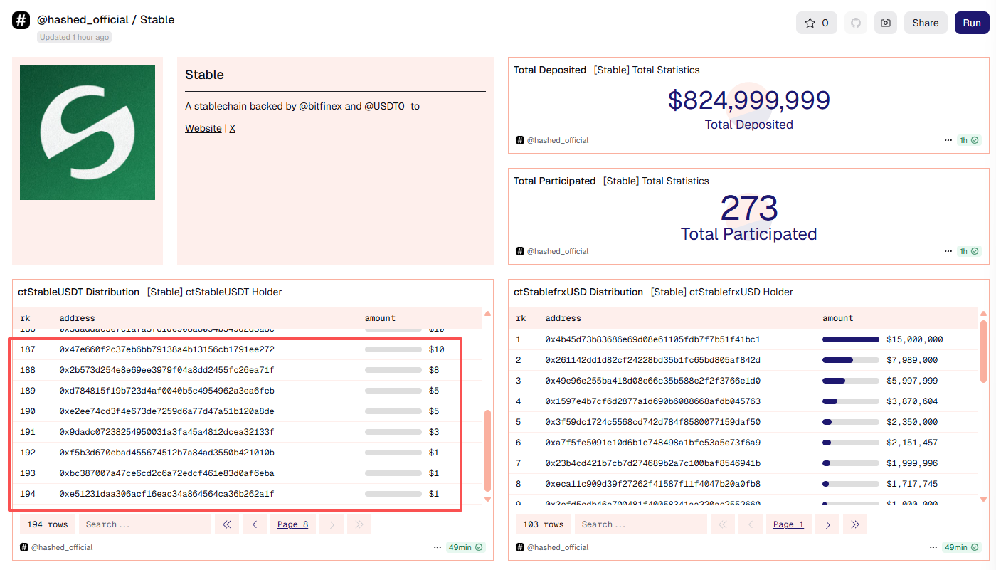根据 Dune 数据,本次总额 8.25 亿美元的预存活动实际仅有 273 个地址参与,普通用户的参与比例几乎可以忽略。 更值得注意的是,在所有参与地址中,有近 40 个地址的存入金额低于 500 USDT,甚至出现了 1 USDT、3 USDT、5 USDT 或几十 USDT 的极小额存款,社区讽刺称这些小额地址只是用来充人数的道具,毫无真实参与感。