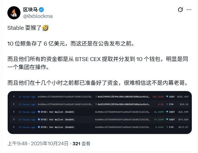 Stable 第一阶段 USDT 预存活动在开启后迅速引发巨大争议,被大量社区用户质疑存在严重的“老鼠仓”操作。 按照官方时间线,Stable 于北京时间上午 9:10 才正式发推宣布开放预存,但链上数据显示,早在 8:48 就已经有人提前存入资金,与官方时间明显不符。