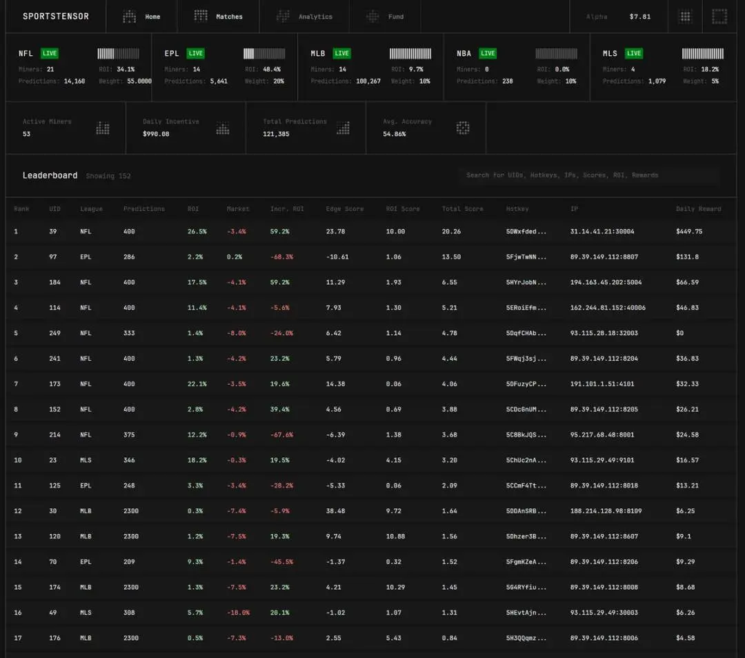 这是一个专注于「击败市场赔率」的子网,旨在挖掘全球体育博彩市场中的「优势机会」。这是一场持续性竞赛:机器学习工程师需部署模型,预测美国职业棒球大联盟(MLB)、美国职业足球大联盟(MLS)、英格兰足球超级联赛(EPL)、美国职业篮球联赛(NBA)等主流体育联赛的赛事结果,能实现盈利的「最佳模型」将获得 SN41 Sportstensor 阿尔法代币奖励。