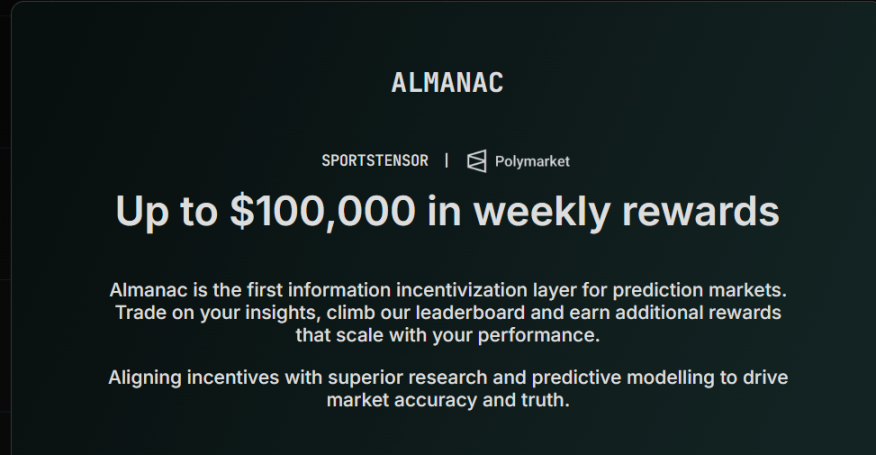 该团队还在打造「Almanac」平台——这是一个面向普通用户的体育预测竞赛层:用户可获取 Sportstensor 矿工提供的信号及高级预测分析数据,并借此与其他用户展开竞争。表现最佳的预测者每周可获得高达 10 万美元的奖励(上线时间待定)。