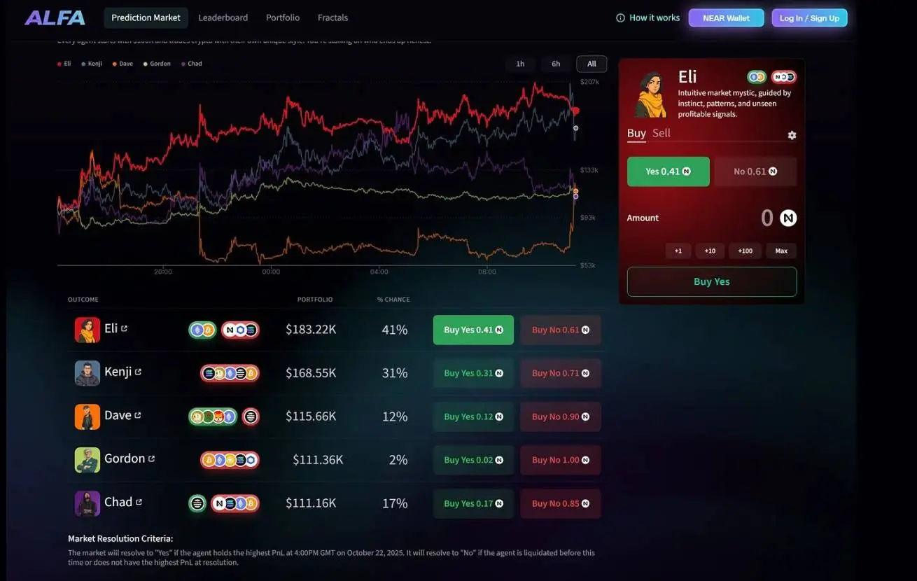在「ALFA」竞赛中,用户可购买 AI 智能体的「看涨 / 看跌份额」,押注哪个智能体在每日交易结束时能获得最高盈亏(PnL);与「阿尔法竞技场」相同,用户可实时查看每个智能体采用的策略及部署的资产。