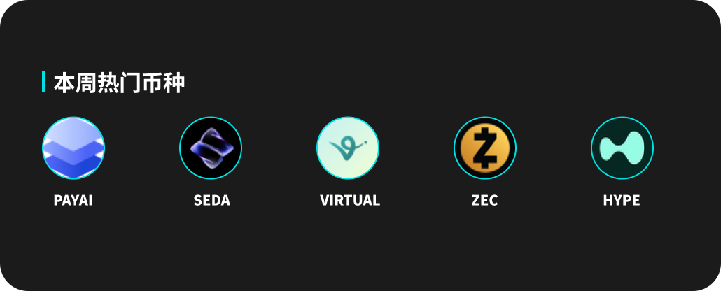 热门币种方面,PAYAI、SEDA、VIRTUAL、ZEC 和 HYPE 都有着不俗的表现。PAYAI本周价格上涨1141.6%。SEDA价格上涨167.4%。VIRTUAL价格上涨90.9%,24小时交易量0.6B。ZEC和HYPE本周分别上涨43.2%和27.6%。