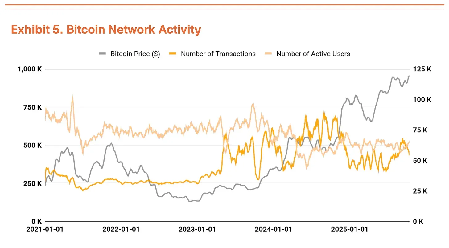 比特币的交易笔数和活跃用户数与上一季度保持相似水平,表明网络增长势头暂时放缓(图表5)。与此同时,总交易量呈上升趋势。交易笔数减少但交易量增加意味着在更少的交易中转移了更大的资金,这表明大规模资金流动有所增加。