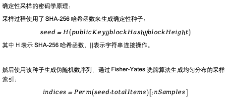 基于种子系统,采样过程完全确定性,确保验证的公平性。通过使用SHA-256哈希函数和验证者的公钥、区块哈希、区块高度等信息生成种子,确保所有验证者使用相同的采样策略: