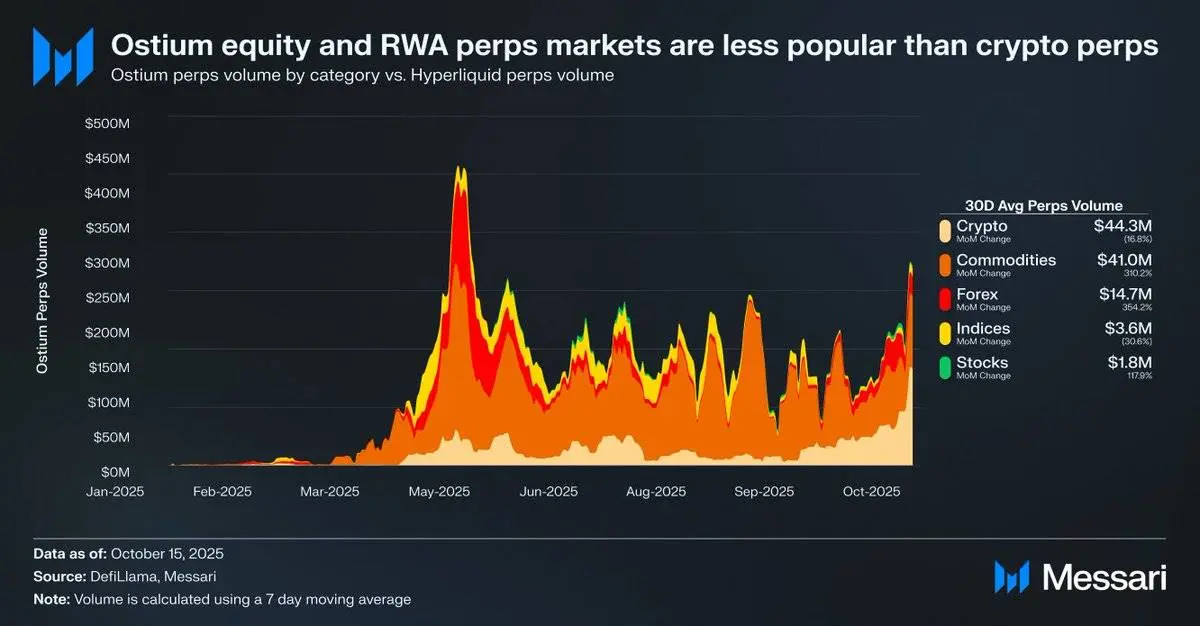 股票永续合约被认为是链上市场不可避免的下一片蓝海,但目前的数据表明短期内这一领域还难以实现突破。Ostium 作为一个专注于真实世界资产(RWAs)的永续合约去中心化交易所,其日均股票永续合约交易量仅为180万美元,而加密货币永续合约的交易量则达到4430万美元,这反映了需求的疲软。