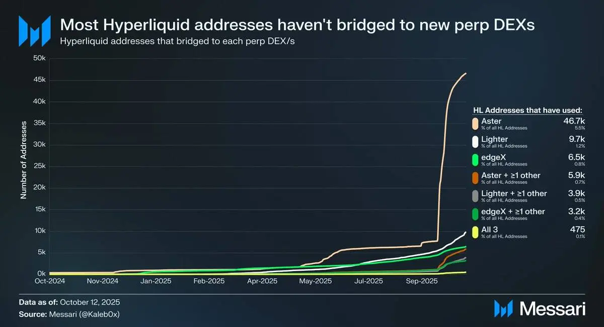 让我们探讨在 Hyperliquid 的 HIP-3 升级背景下,股票永续合约可能的发展方向。HIP-3 引入了去许可的永续合约市场,而数据显示, 少于10%的 Hyperliquid 地址已 桥接 至 Aster 、Lighter 和 edgeX,甚至更少用户选择了多个永续合约去中心化交易所(DEX) 。这表明 Hyperliquid 的资金具有粘性,且质量较高。基于此数据,可以从两个角度预测股票永续合约的未来: