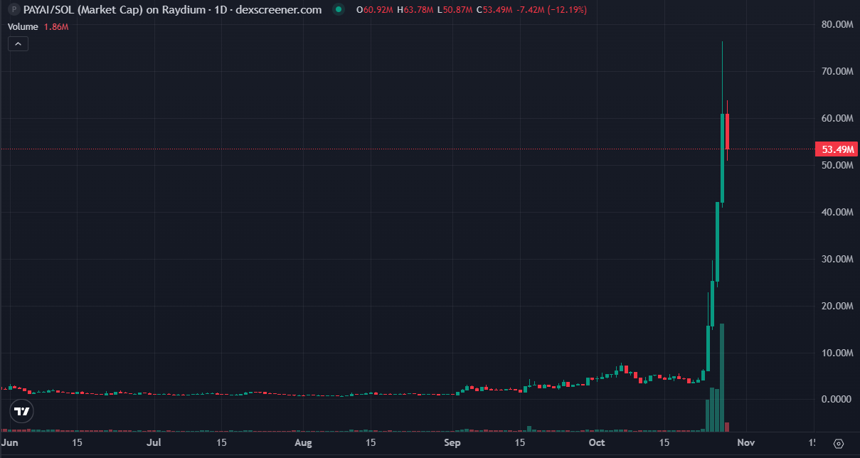 当前市值:PAYAI 市值昨日一度触及 7700 万美元,暂报 5300 万美元。