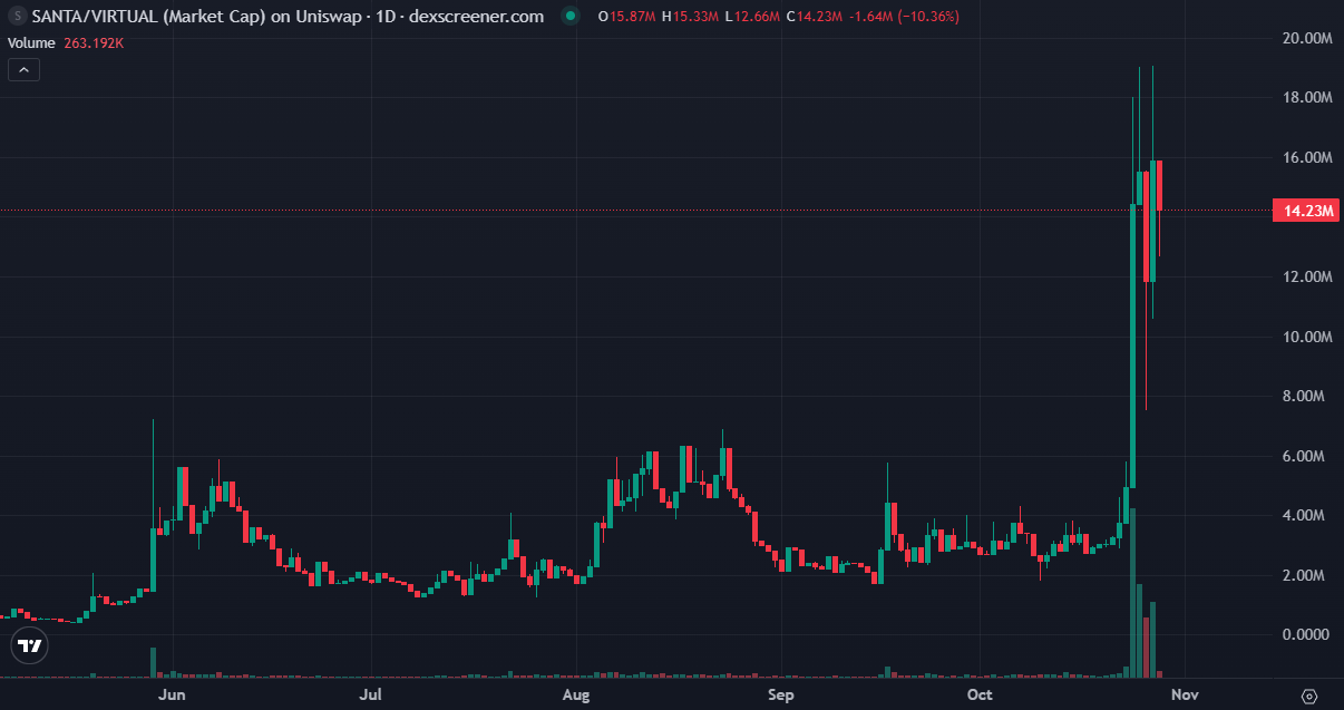当前市值:SANTA 市值近日一度触及 1800 万美元,暂报 1400 万美元。