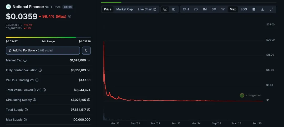 截至 2025 年,NOTE 代币市值仅剩约 166 万美元,从高点下跌超99%,日交易量不足千元,社区活跃度和协议更新频率都较低。