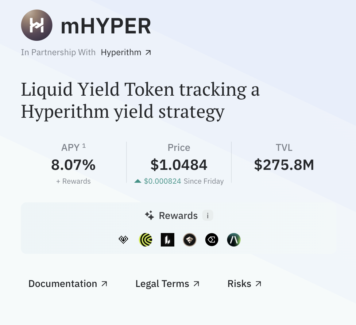 实在存不进去 Stable 的可以考虑下利用 Midas 的 mHYPER( 传送门 )财库间接参与 —— mHYPER 通过借贷给 Hyperithm 2500 万美元间接投入了 Stable 的预存款,资金存入该池后可共享收益。当前 mHYPER 财库的 APY 暂报 8.07%,另外还有一定的 Cap、Lighter、USDai、Ethena、Almanak 等热门协议的积分敞口。